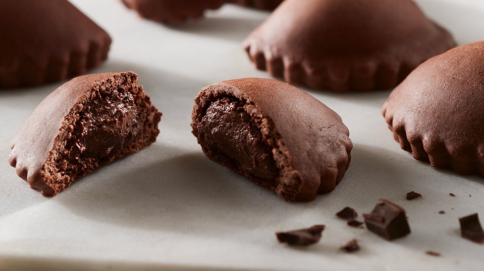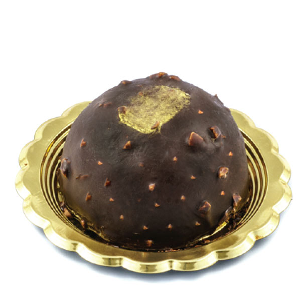 Mousse alla gianduia con granella di nocciole tostate, cuore di crumble di biscotto caramellato, ricoperto da glassa rocher