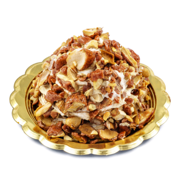 Gelato alla nocciola con cuore di nutella, panna, ricoperto di mandorle caramellate.